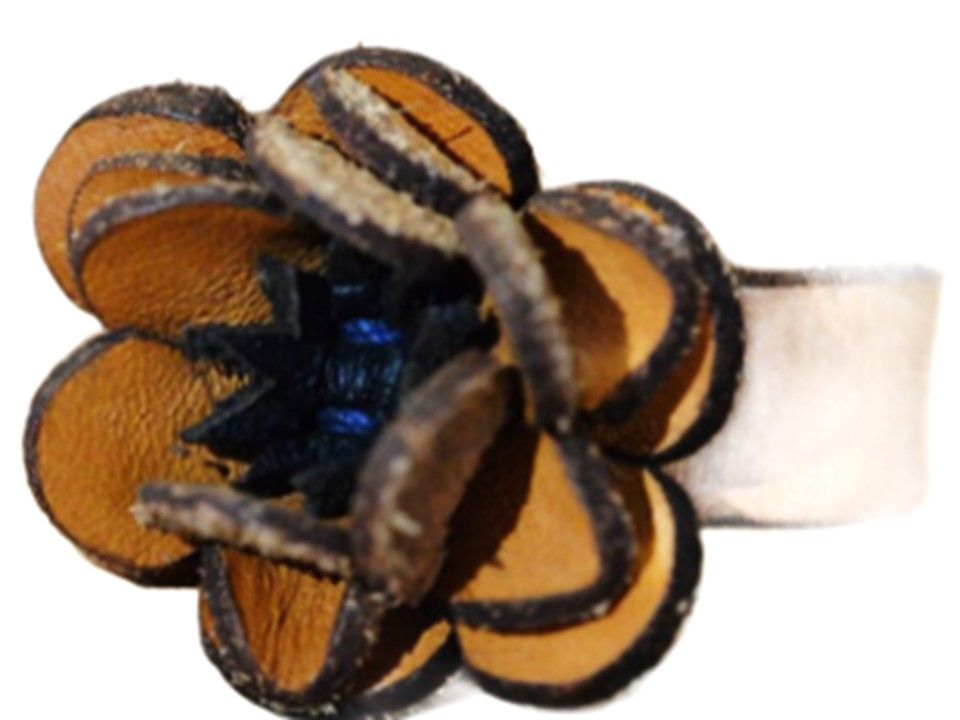 Modèle floral de bague tout cuir. Superposition de couches de cuir en tannage végétal cousues à la main au fil de lin. Plusieurs tailles sont disponibles.