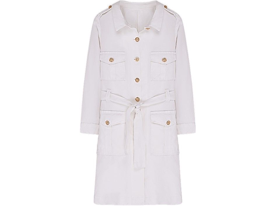 Confectionnée dans une toile blanche légère, elle se distingue par ses boutons dorés emblématiques, ses quatre poches plaquées et ses épaules légèrement marquées. Un design net, sans superflu, pour une femme qui avance, voyage, décide.