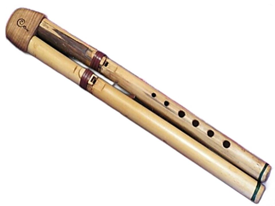 Ces doubles flûtes Amérindienne en canne de Provence, jouent une gamme pentatonique mineur de Si, Do ou Ré (en gardant bouché le 4 eme trous en partant du bas) et jouent une gamme diatonique avec tous les trous. La 2eme joue la même tonalité en bourdon.