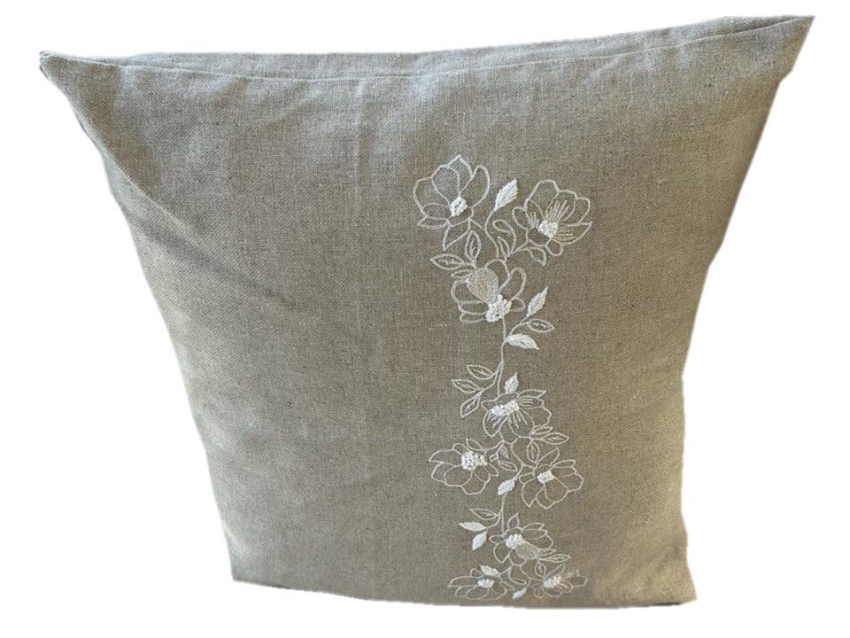 Les dimensions de cette housse portefeuille en lin brodé de roses sont de 38 x 38 cm. Elle est destinée à un coussin de 40 cm de côté.