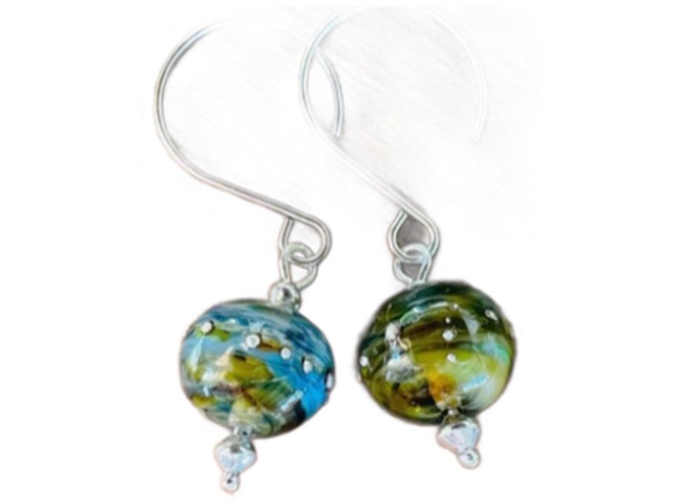 Incrustées d'argent fondu à la flamme, les perles de verre sont montées sur un crochet d'oreille en Argent massif 925.