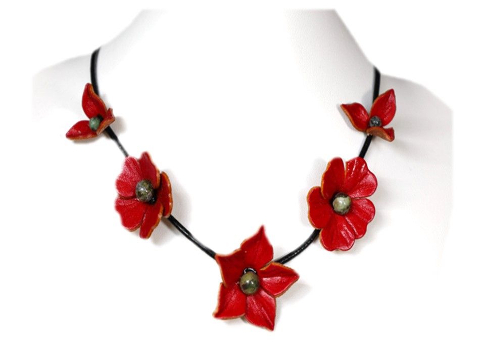 Collier cuir femme 5 fleurs variées, couleur au choix.
